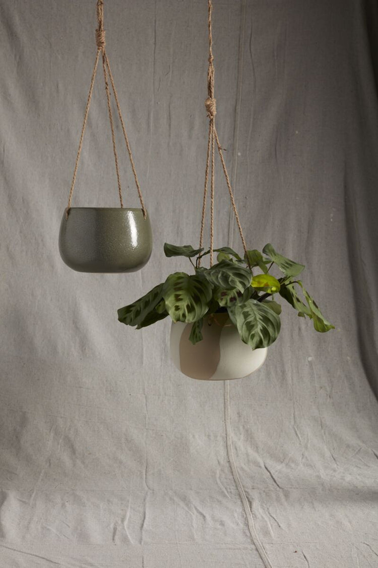 Trailing plants will be right at home in this earthy hanging pot (no drainage hole). White, tan & textured, the planter is sand glazed with a crackle, hand-printed pattern reminiscent of a foamy sea. A jute rope adds to the ocean-inspired look.