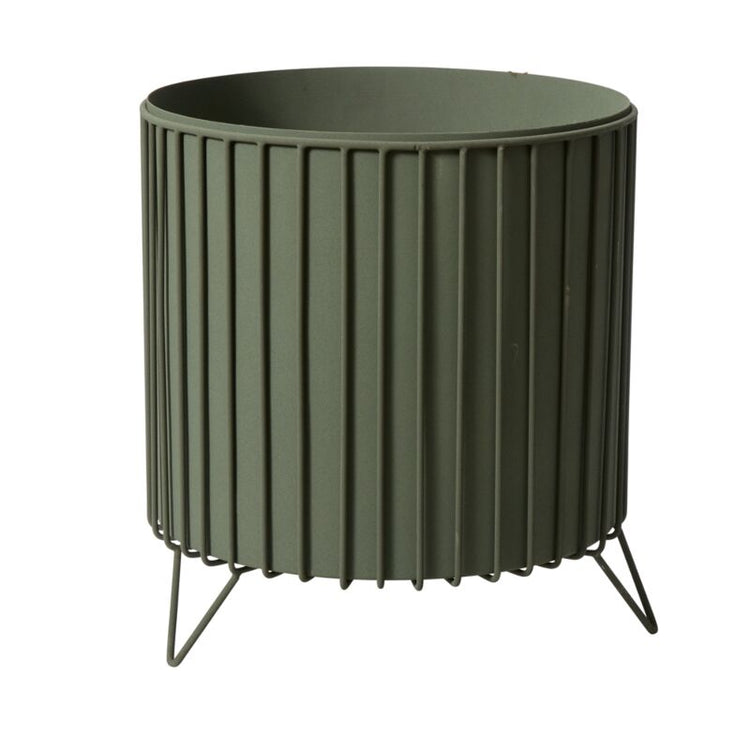 Add a little sage green serenity to plants with the small aluminum metal Corum Planter, featuring a sandy textured green glaze & a matte finish. A wire frame stand with trendy triangular feet gives the watertight pot a lift. The perfect size for an 8-inch drop-in pot, this modern indoor planter is ideal as plant shop retail & brings a pop of color & sophistication to the home.