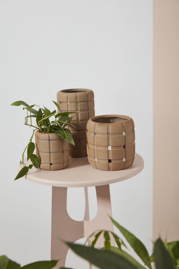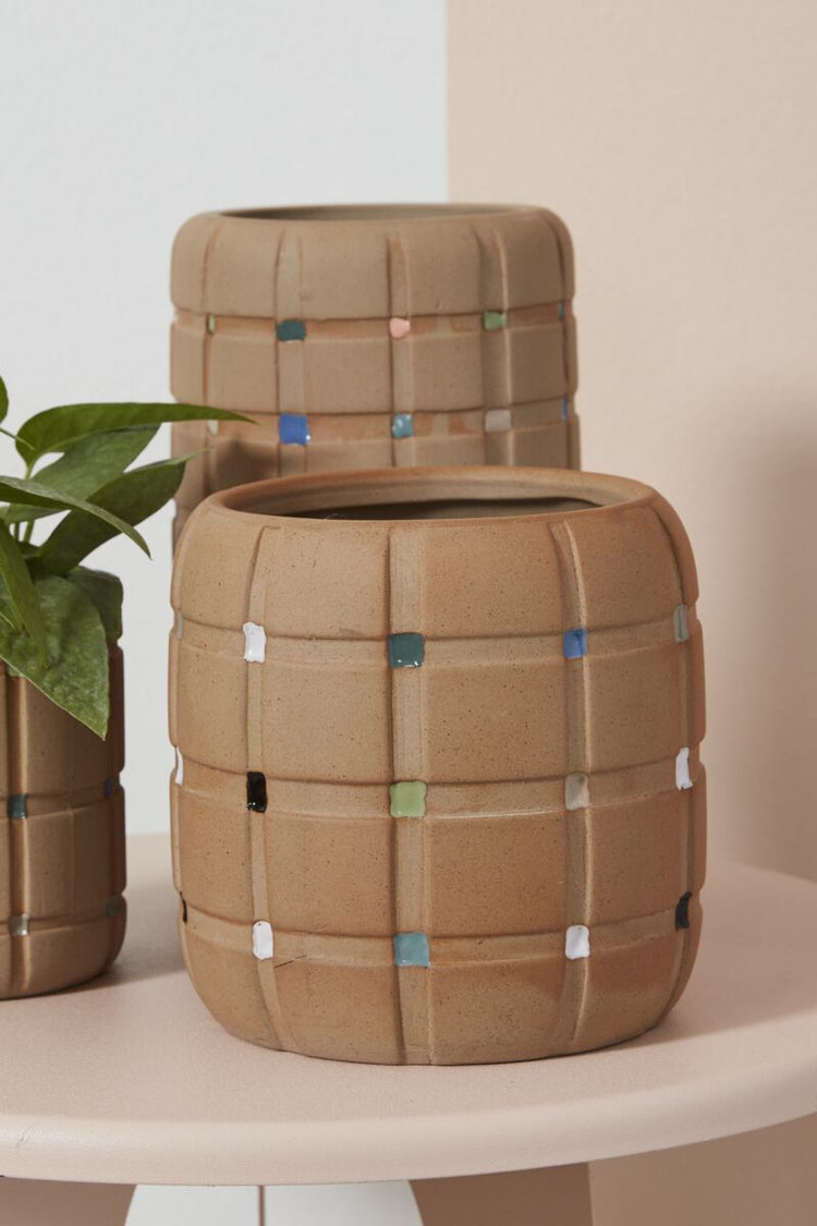 Perfect for a minimalist home & modern plant shops, the small Cubism Pot brings textured design, playful pattern, & a subtle pop of color to decor. Made from natural bisque, this watertight indoor plant pot features a curved rim, a dimensional carved grid, & glossy squares of organic, hand painted color at each grid intersection. Add a drop-in plant or a small bouquet of dried or fresh florals to bring out the pot's colors.