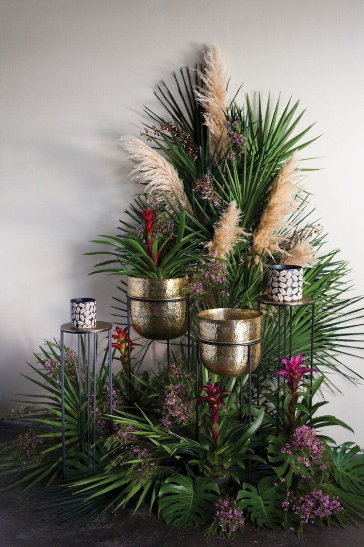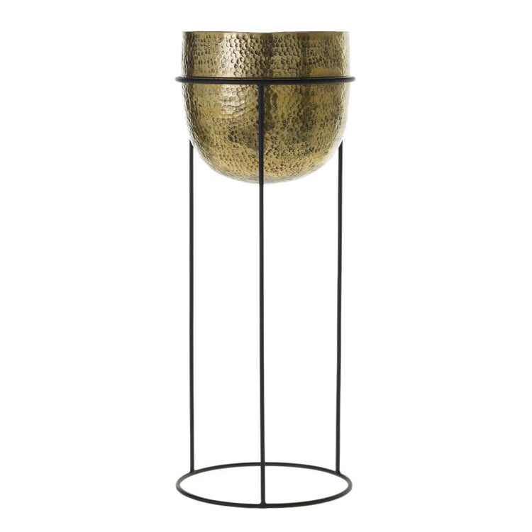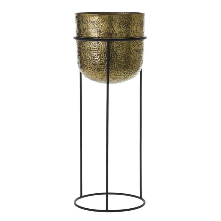 The Forum Plant Stand is a hammered metal pot with antique gold finish in a modern black stand, marrying style and function.