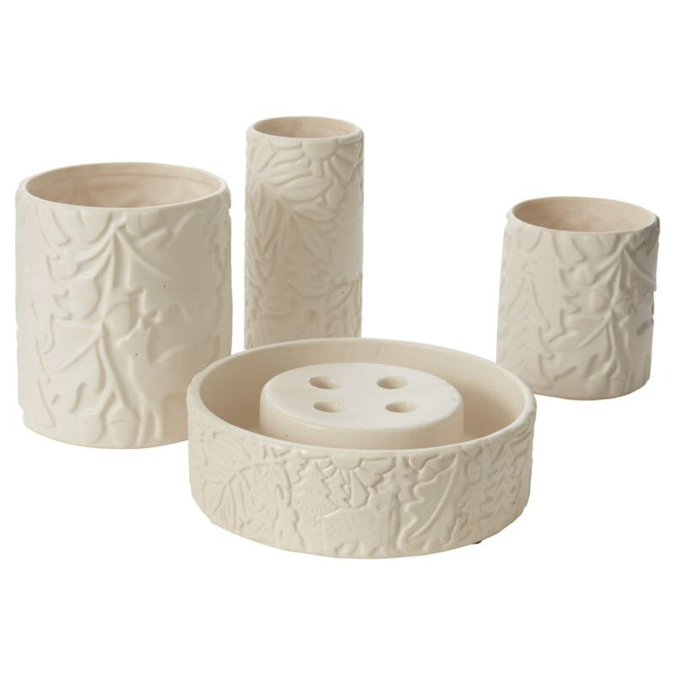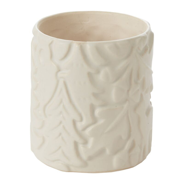 Create a winter-woodsy scene with the small ceramic Gingersnap Pot, featuring a bas-relief forest scene, including bears, deer & trees, with a warm white glazed finish. Fill with a festive plant, branches, or greenery.