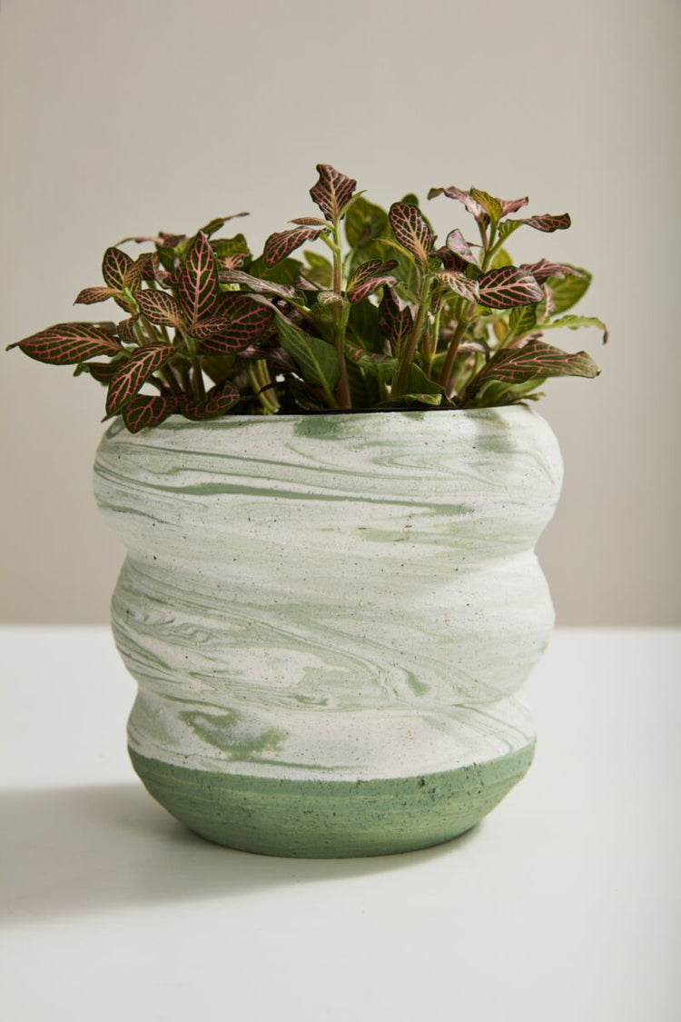 Like a sculptural art piece for plants, the green & white marbled clay Greenway Pot is a striking complement to 4.5-inch drop-in plants. This watertight planter features a glazed interior but natural surface with beautiful color variation across each piece. A painted green base provides a solid section below the patterned top & matches the marbling, while a stacked ring design across 3 layers gives the pot unique dimension.