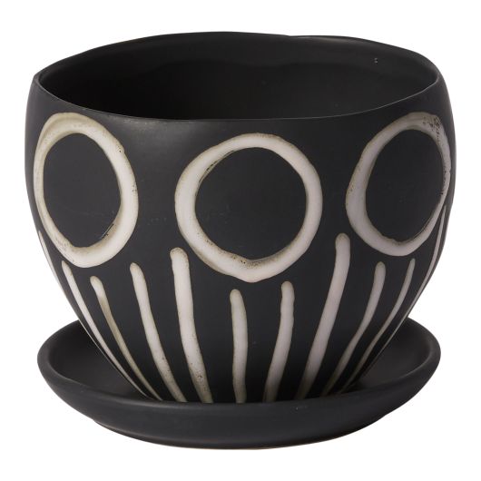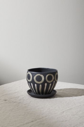 The Hootie Hoo Pot is bowl shaped with a contrasting hand drawn line and circle pattern. Complete with a drainage hole and saucer, it is a versatile container for any plant.