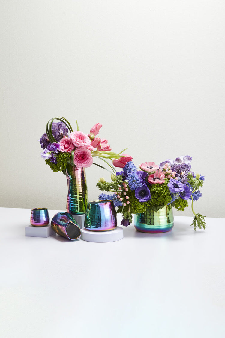 Like an organically shaped, artisanal piece just taken off the pottery wheel, the iridescent stoneware featured in the Tegan Collection are stunning vessels for florals or plants. An oil-slicked glaze offers trend-driven pattern & color for added visual impact. Perfect for plant shops, wedding & event design, floral design, or as an everyday home decor pop of pride, this pot rises to any occasion.