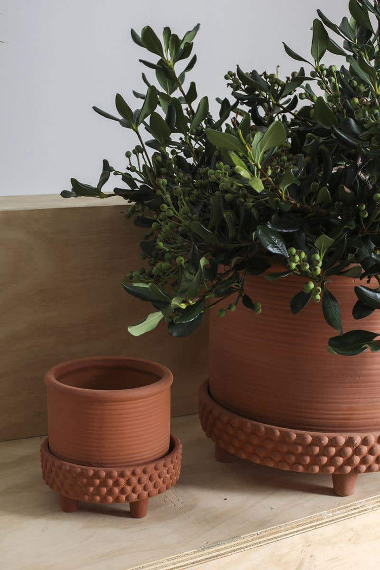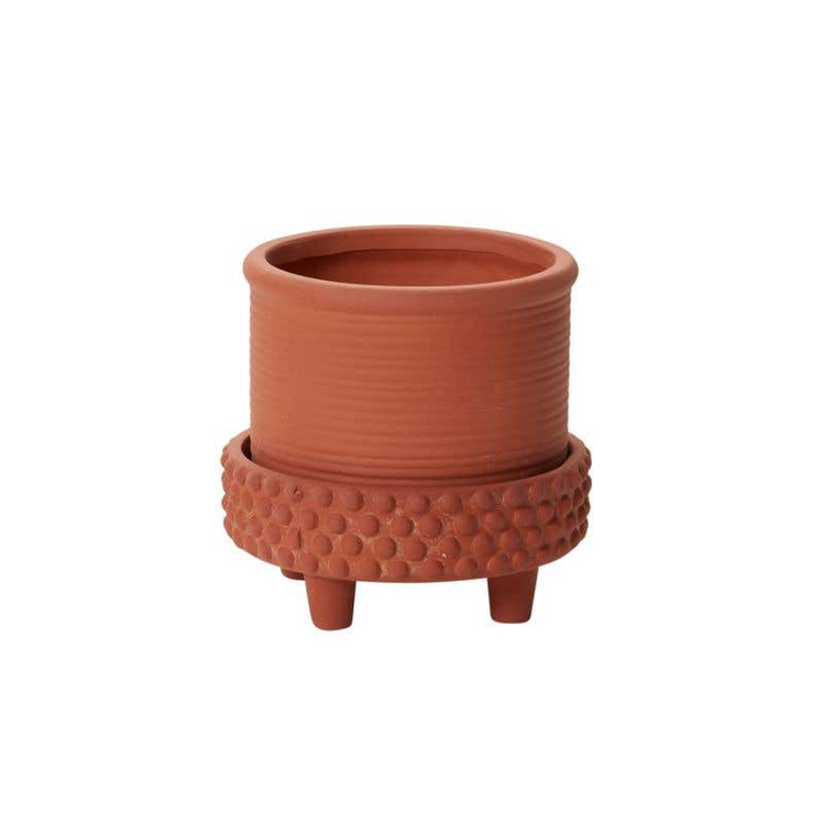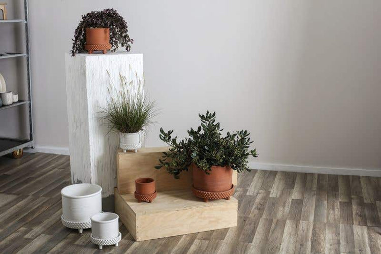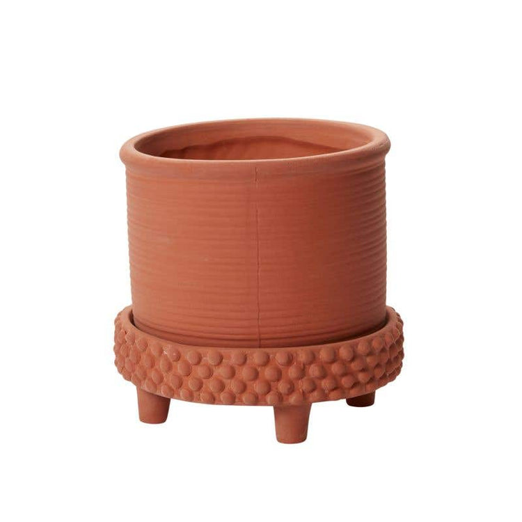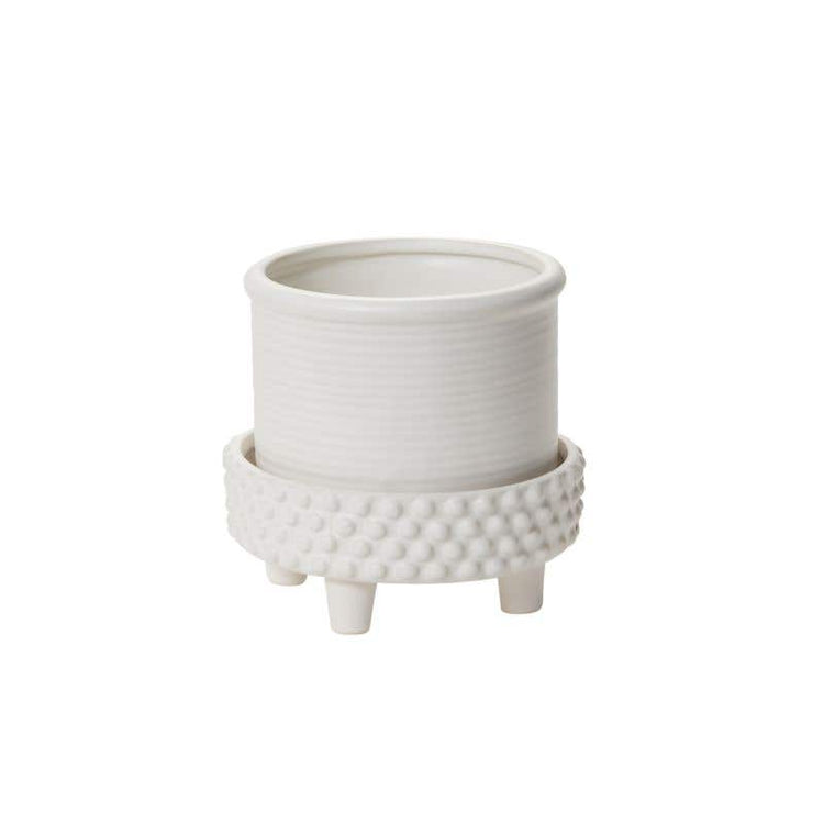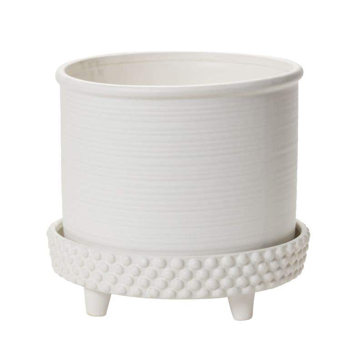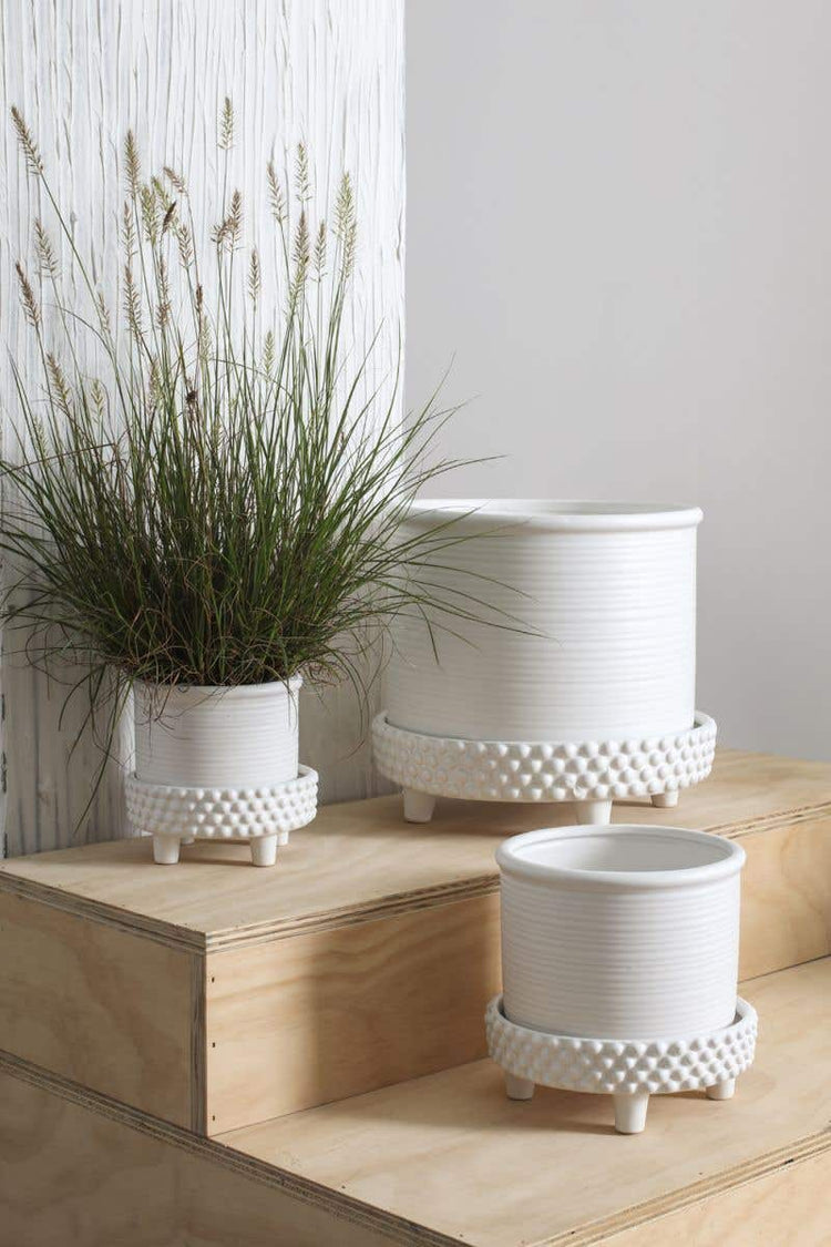 terracotta finished in matte white on the Jane Footed Pot features embossed dots and stripes, elevating your favorite plants beyond ordinary. Suitable for outdoor or indoor use, it features a drainage hole and footed saucer.