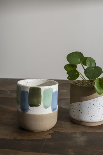 The Jazzy Mug in ceramic features a hand-finished painted design and a two-tone glaze in bisque and glossy paint. Food safe and designed for use as a hand-less mug, the Jazzy Cup is versatile enough to keep your kitchen modern and artful, or to house a small plant or your favorite stems. Holds 6 oz.