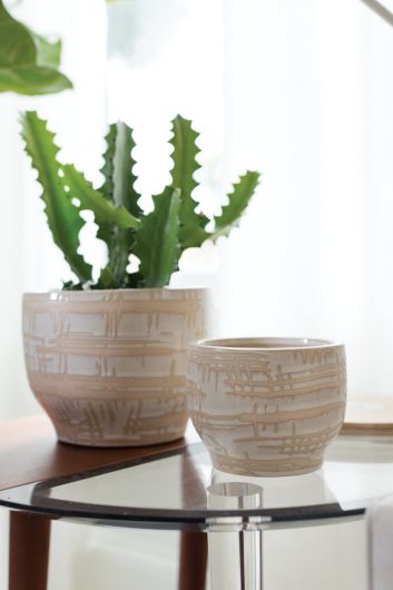 Neutral earthenware in two-tone glaze pattern and finish, the Kardi Pot is a modern classic that is versatile enough for every design.