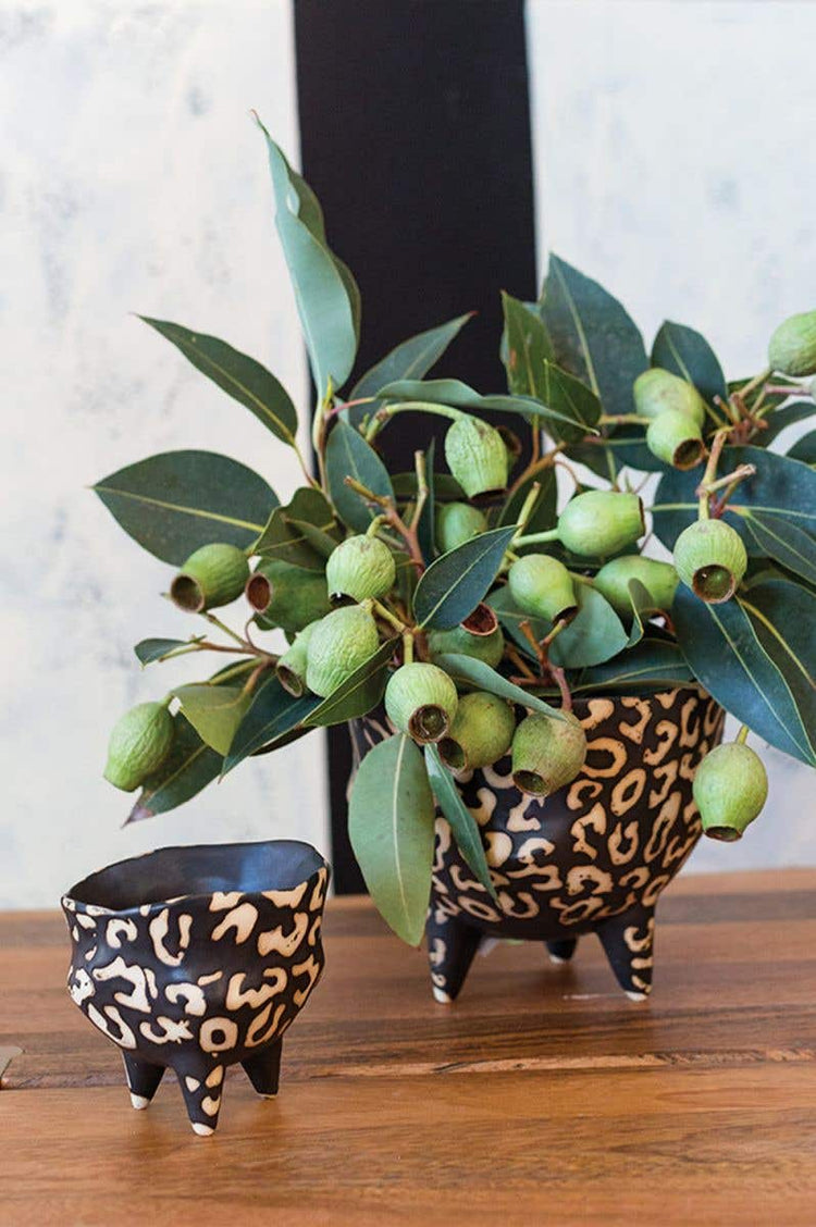 The footed Leesi Pot features an organic silhouette and a stamped design inspired by animal print, with a matte black finish for an elegant look.