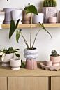 Add variety and height to a prized plant collection with the Lefkara Pot, a uniquely shaped ceramic vessel designed to give plants a lift and a little color. A beautiful pinkish purple base is topped off with a glossy reactive glaze on the 2 rounded top sections. The base of this pot is elevated and open to catch water that drains from a 4-inch standard grower pot. The open foot means the Lefkara can double as a vase for a bunch of fresh flowers.