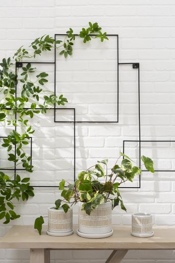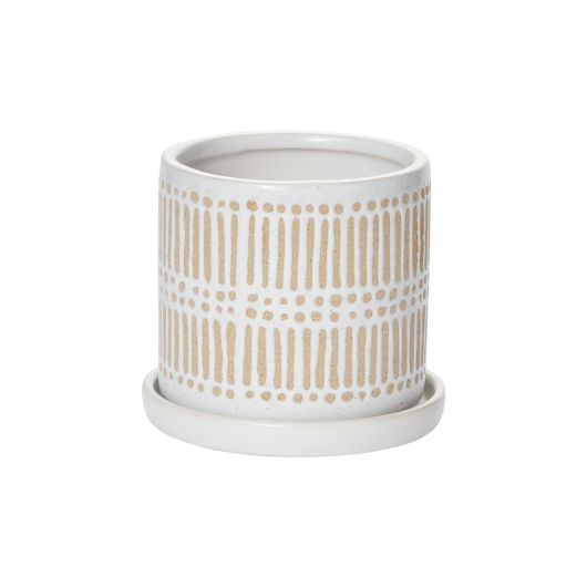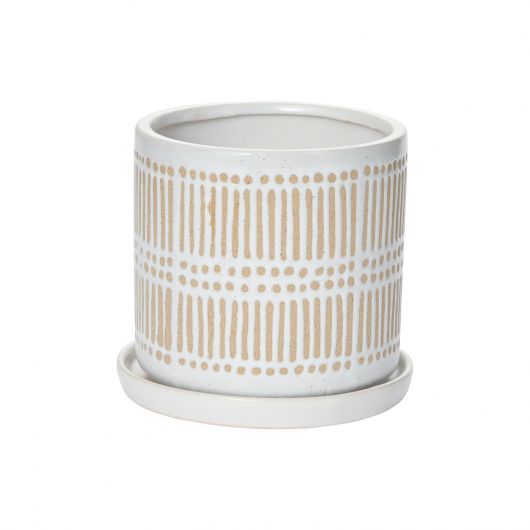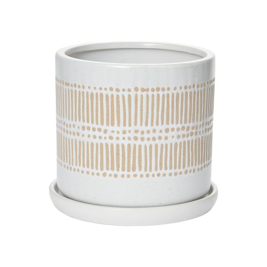The Linden Pot is neutral, minimalist, and modern, with added interest from its tone-on-tone tan tick design pattern. Includes a drainage hole and saucer for ease of plant-care, as well as an elevated status on your shelf.