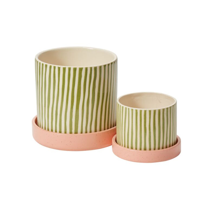 Reminiscent of a watermelon with its playful striped pattern & energizing hues, the small Melancia Pot lifts up the room with color. This pot with a drainage hole features hand painted glossy green vertical stripes on a natural clay base that contrasts nicely with the smooth matte coral pink saucer with a speckled finish. This fun indoor plant pot makes a happy addition to your home decor.