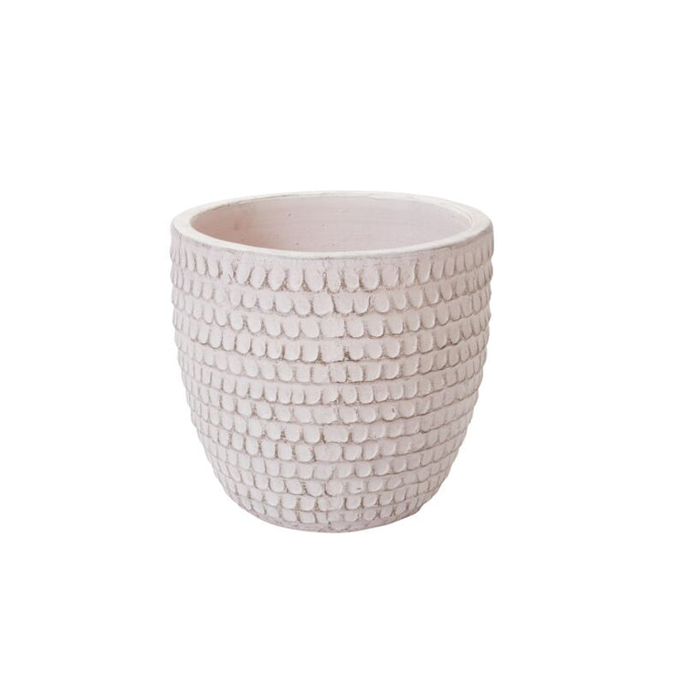 With a bubble design that creates dimensional texture, the classic-shaped medium Nellie Pot offers a neutral color & a drainage hole, perfect for any plant. This outdoor planter features a painted creamy white finish & thumbprint divots that wrap around the terracotta pot & have an organic, irregular design. This sturdy & heavy pot makes a great basic on a patio or porch.