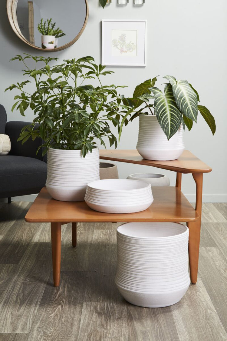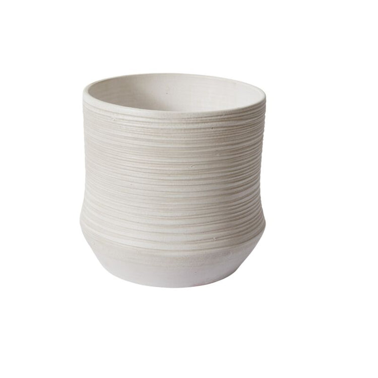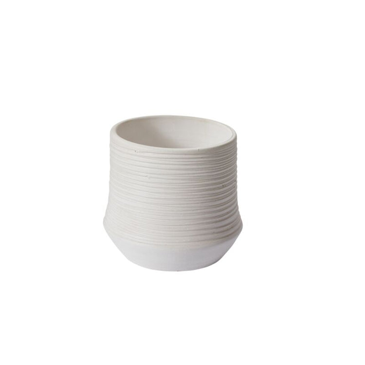 Add an organic finish & textured design to a tabletop centerpiece with the clean & classic, artisanal Offshore Collection, made in Portugal. With ribbed variations in surface texture wrapped around the exterior, this white ceramic indoor planter come in the ideal sizes, depths, & styles for holding a mini succulent garden or displaying household objects (not food-safe).