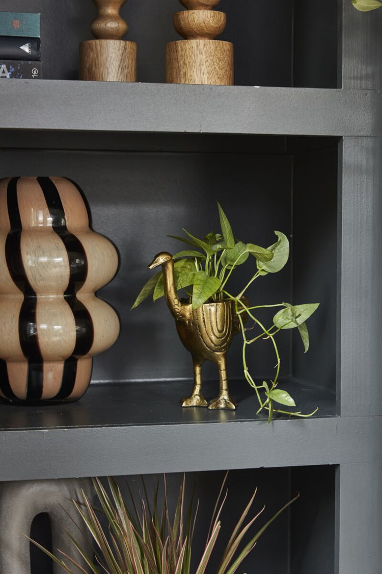 Behold the whimsical charm of the Ostrich Pot, a recycled cast aluminum curiosity. This watertight piece is designed to fit a 2.5-inch drop-in pot, or it can be used as a decorative catchall on a desk or bookshelf. Crafted from a hand-carved mold with dimensional linework, this sculptural vessel with an antique gold finish showcases handcrafted artistry & timeless beauty in every detail.
