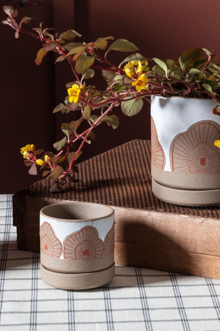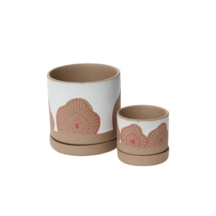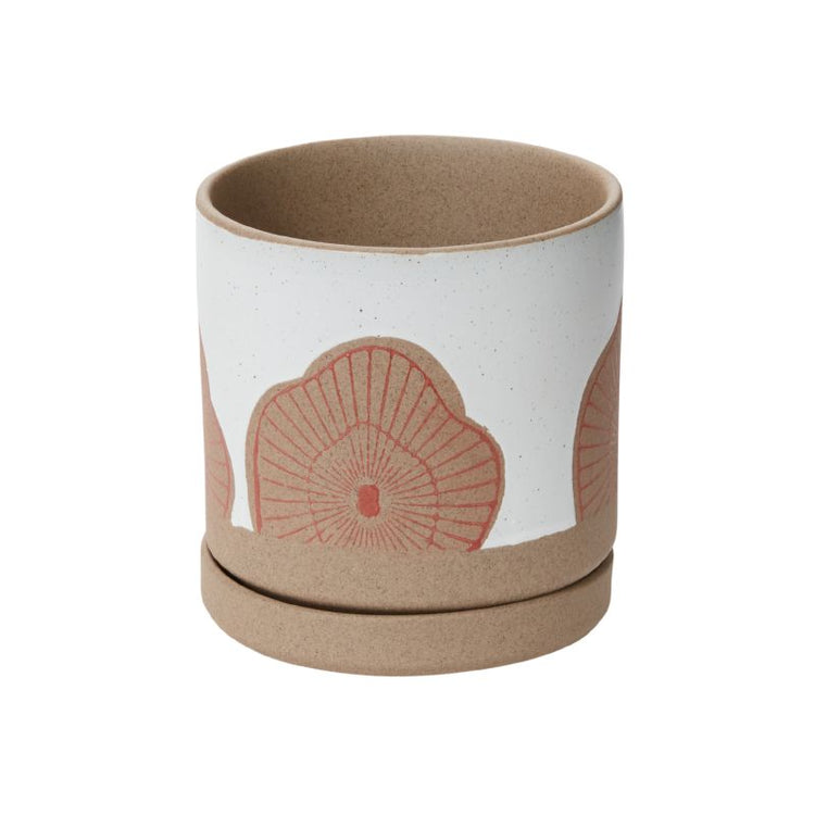 The Protea Pot is a modern and abstract way to bring nature motifs into a Harvest presentation. With a sandstone base, the pot has hand painted mushroom motifs set in a white glaze.