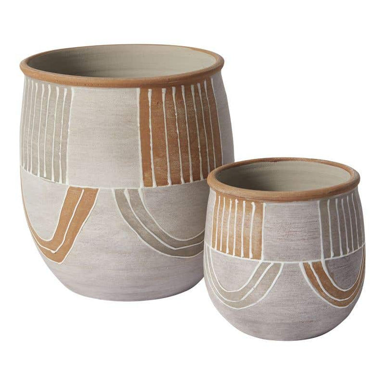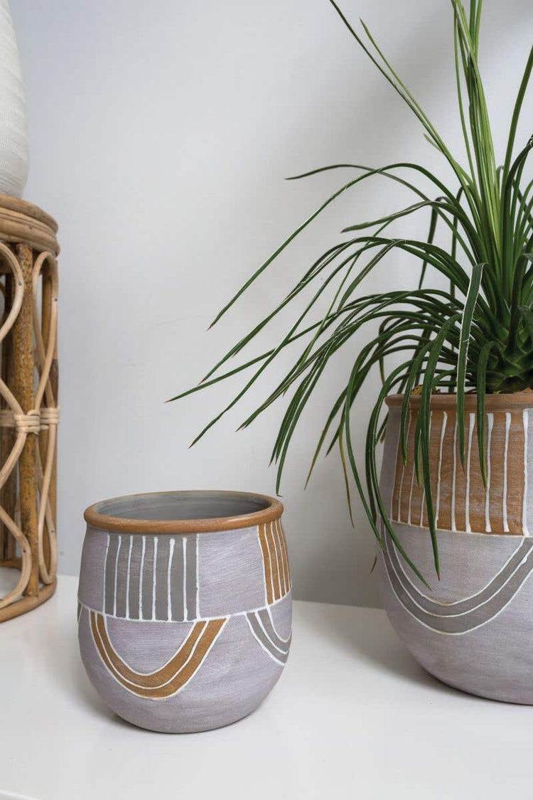 The Restoration Pot is a calming combination of natural terracotta that is hand-painted grey, and detailed with a white line pattern.