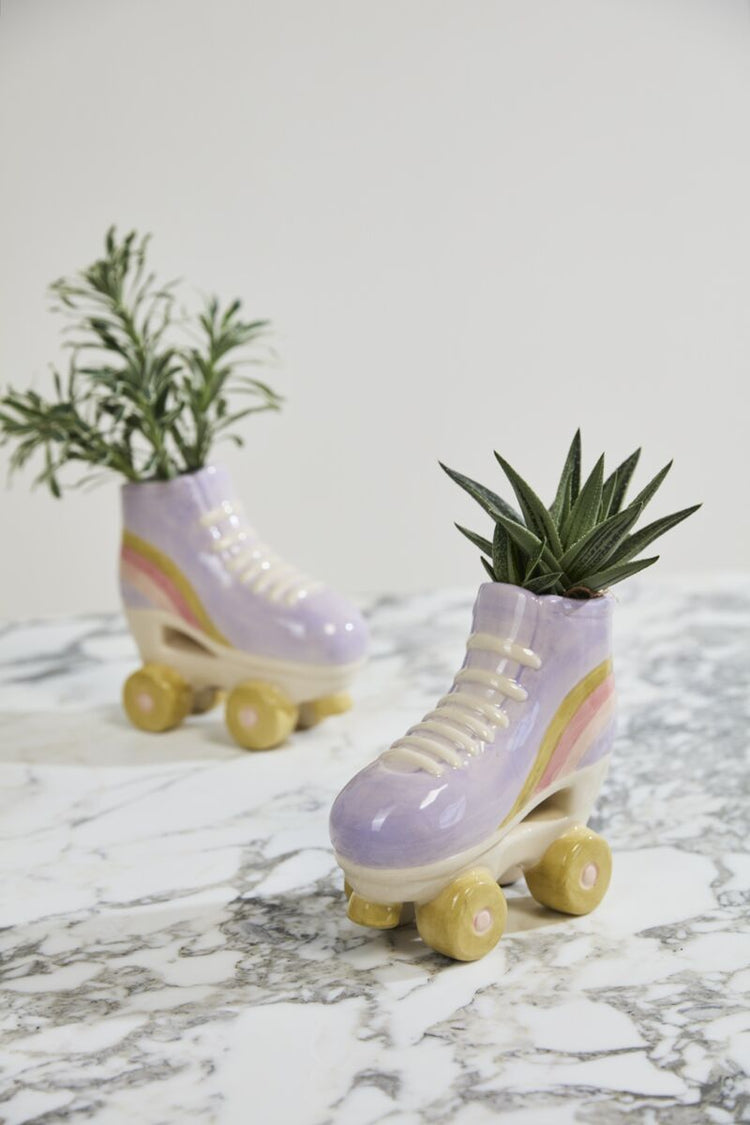 Roller skates are always trending, so why not have a version for plants? This ceramic Roller Skate Planter adds quirky charm to any corner of the room, especially filled with a small plant, airplant, or even a bunch of florals. This dimensional skate features 4 yellow wheels (plus a toe stop!), shoelace details, a light purple glaze, & multicolored stripe. Perfect for plant shops or home & gift stores, this makes a playful gift for plant lovers.