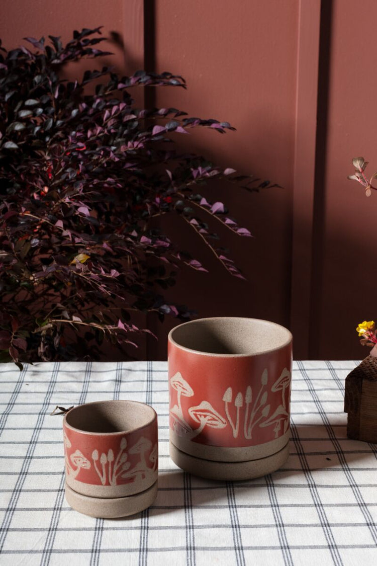 A relief of a woodland mushroom scene wraps around the Scavenger Pot, a sandstone pot complete with drainage hole and saucer. The mushroom scene is offset by a red toned glaze, and is perfect for a 3" or 4.5" drop in plant.