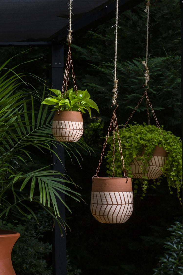 Create a canopy of lush plants and warm terracotta with the Severn Hanging Pot, a planter with an off white painted chevron pattern around the surface. A metal chain with a hook at the top stems from three points on the pot for level hanging. With no drainage hole, the Severn is best for drop in plants that can be easily removed for watering.
