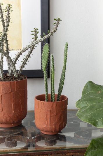 Add a boost of neutral style to all your plants with the footed Stratford Pot, featuring a continuous geometric relief design and natural terracotta finish.