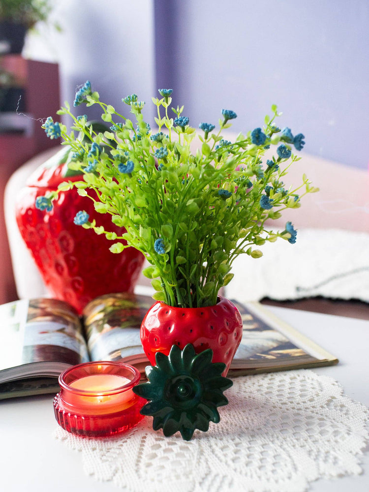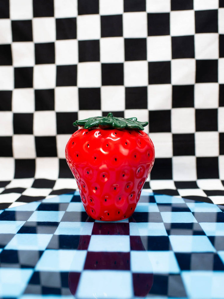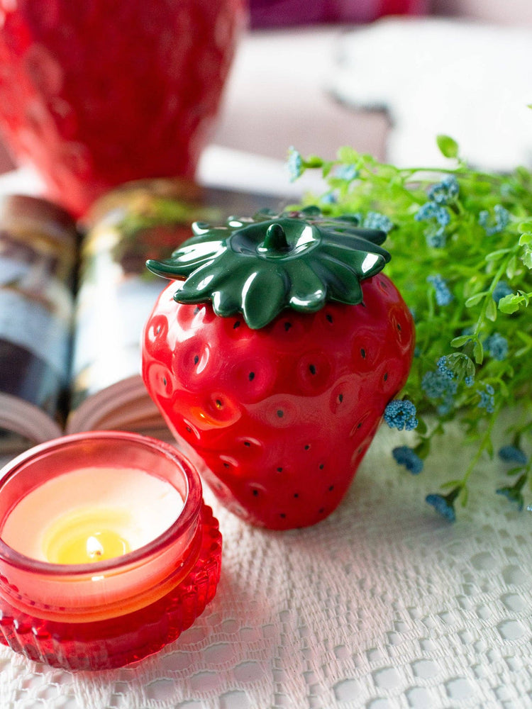 How adorable is this red and green strawberry jar? Opens from the top stem and is both cute and functional! The lid seals tightly, so you won't have to won't have to worry about whatever you decide to put inside!