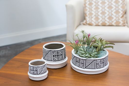 The Safaa Pot is hand-crafted from ceramic and features a stamped design and modern silhouette.