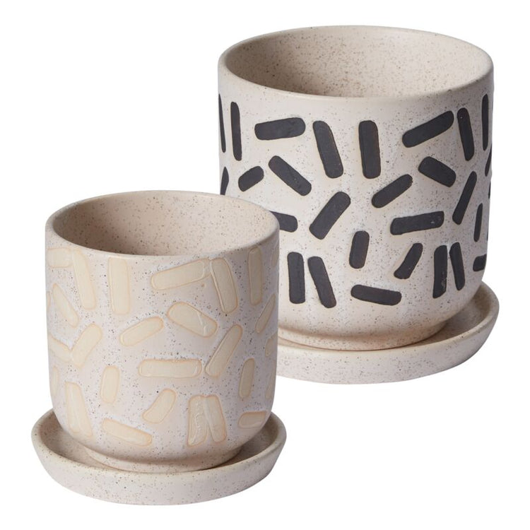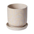 The Sundae Pot features a sesame glaze with stamped shapes scattered across the surface. Plant happiness is a sure bet because of this pot's drainage hole and saucer.
