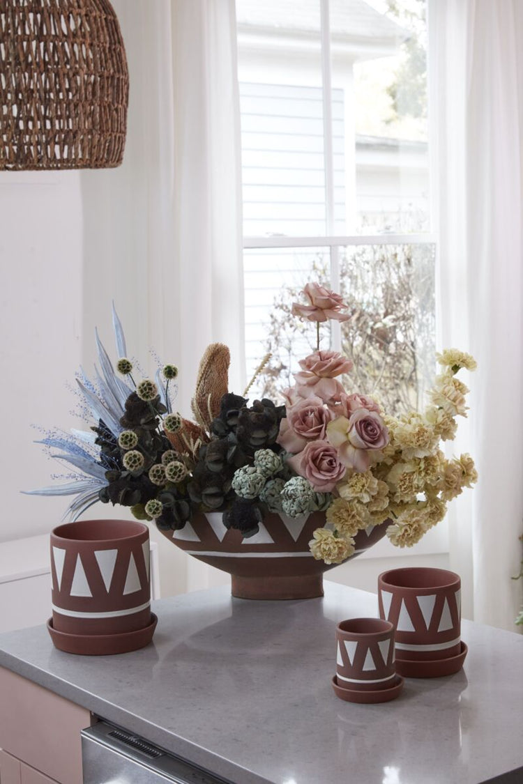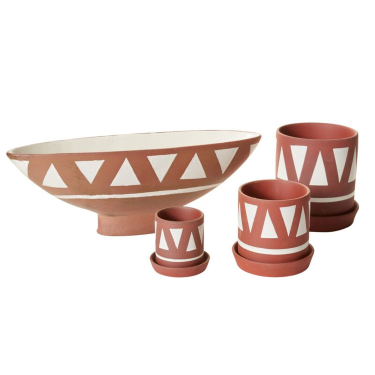 Made for displaying plants & grounding surfaces with textural dimension & artisanal design, the medium terracotta Tajin Pot brings a modern earthiness to the home. Featuring a drainage hole & saucer to collect water, this pot elevates any plant & home decor with its organic, hand painted application of white glazed geometric triangles on the dark terracotta exterior.