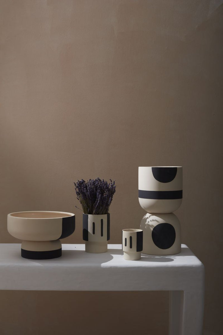Sculptural & versatile, the footed Trabar Pot gives decor a modern lift with its unique elevated style & hand painted black patterns. Made from stoneware, this solid piece can be used as a small planter, vase for florals, or decorative centerpiece.