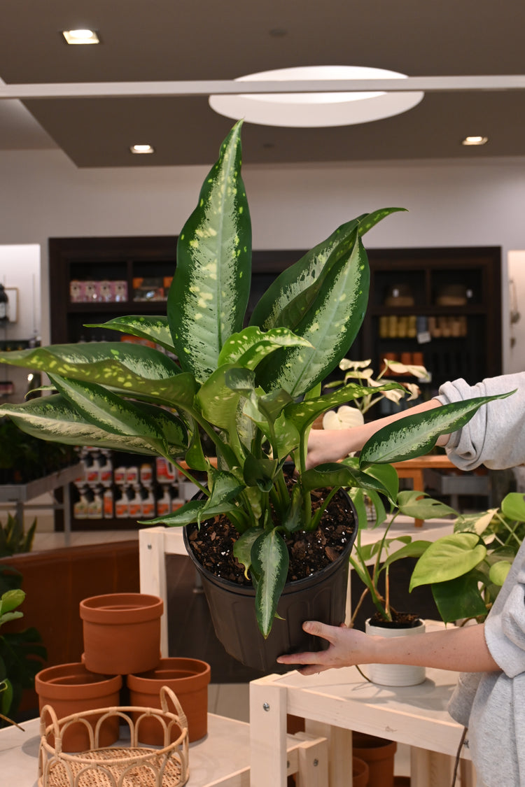 Dieffenbachia plants prefer their soil to be consistently moist and thrive in a filtered light environment with a touch of humidity.