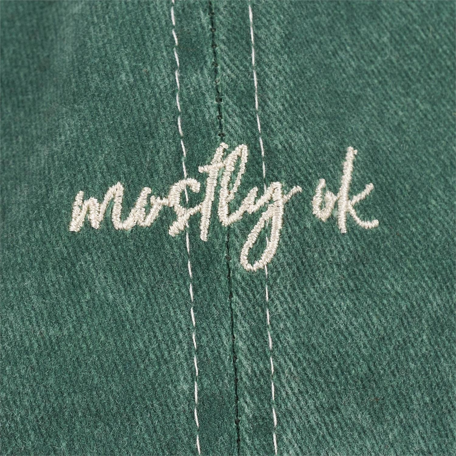 Anyone else done with keeping every little thought to themselves? This green baseball cap displays a relatable sentiment that reads "Mostly Ok" in a hand written style for honest self-expression. Stylish design is fully embroidered on stonewashed cotton for a naturally worn look. Questionables baseball caps are one size fits most with an adjustable buckle closure to create the perfect fit. Hand wash only. Our Mostly Ok baseball cap is perfect for everyday expression.