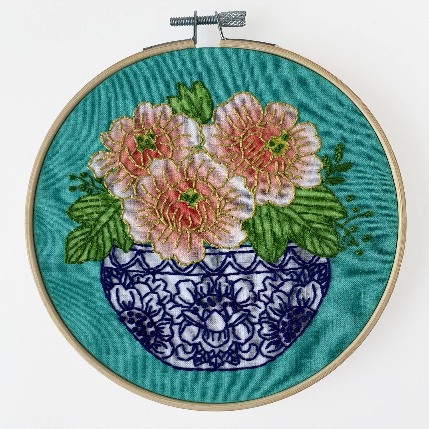 Beautiful coral peony flowers in a blue and white patterned vase is perfect for flower lovers. Beginner Level Embroidery Kit comes with everything you need to complete this 6” hoop: Preprinted fabric, needle, Floss and lots of embroidery tips at rickrack.com. Suitable for beginners and beyond.