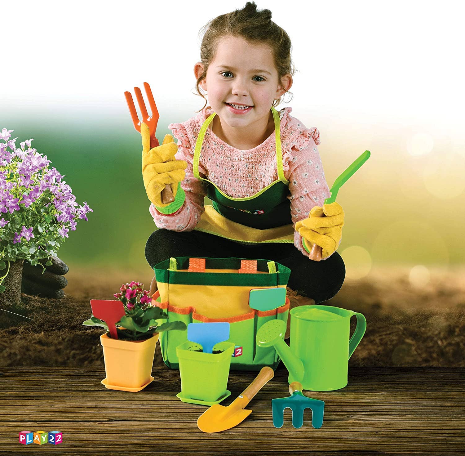 This 12-piece set includes a shovel, trowel, fork, rake, watering can, gardening gloves, plastic seed labels, two buckets, a gardening apron, and a canvas tote, making it an ideal choice for young gardening enthusiasts.
