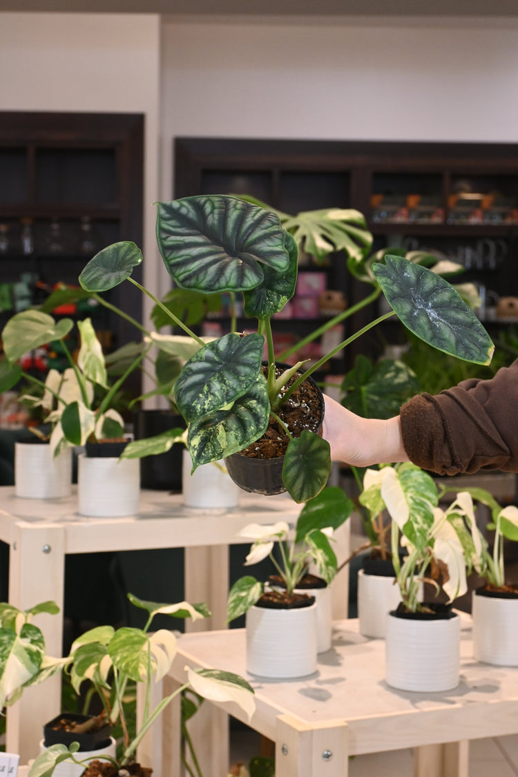 Alocasia plants are humidity lovers and heavy feeders. They prefer bright, filtered light and for their soil to be consistently moist. Water when the soil is dry about 2” down from the top of the pot. Keep your alocasia in a chunky potting mix.