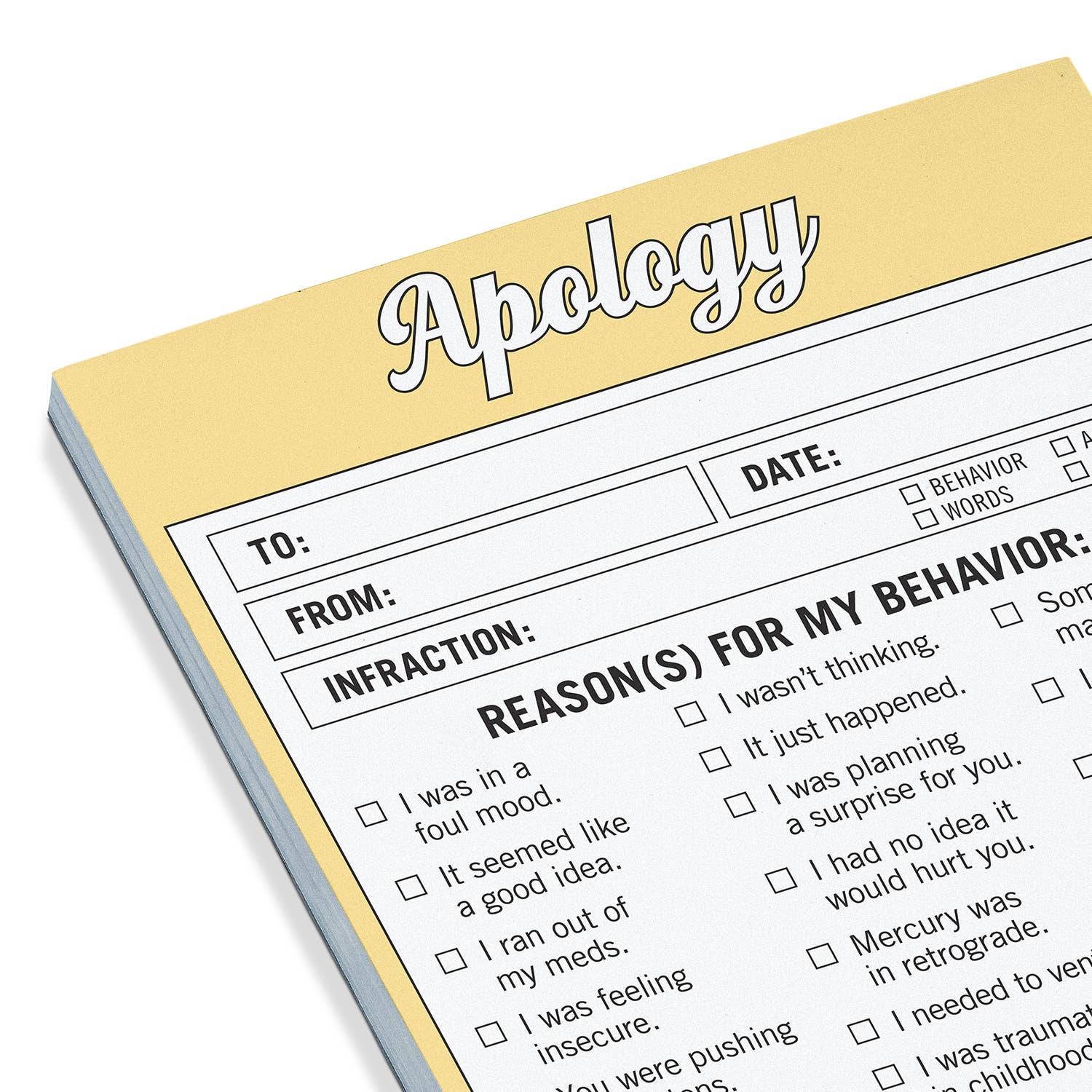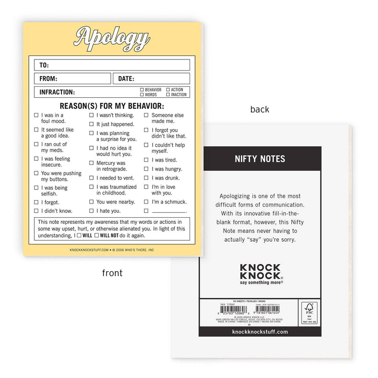 With the Apology Nifty Note, we've taken the difficult, awkward act of contrition and made it easy. Now, by filling in the blanks, you never have to actually "say" you're sorry. Defuse conflicts and avert pouting Modern-day etiquette for the masses 4 x 5.25 inches, 50 sheets