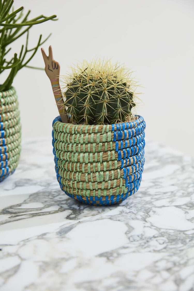 Bring a fresh textured look to plants & home decor the woven Aqua Baskets, featuring a slightly rounded base & blue, white, & green vertical bands across the body layered into a natural grass base tone for a pop of color. The small basket is 5"x5" and fits a 4-inch standard drop in. The large basket is 7"x6.5" & fits a 6-inch standard drop-in plant. A watertight, attached interior plastic lining protects the woven materials from moisture.