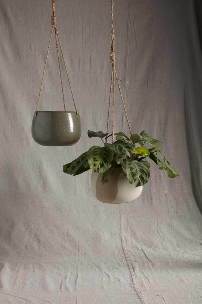 Trailing plants will be right at home in this earthy hanging pot (no drainage hole). White, tan & textured, the planter is sand glazed with a crackle, hand-printed pattern reminiscent of a foamy sea. A jute rope adds to the ocean-inspired look.