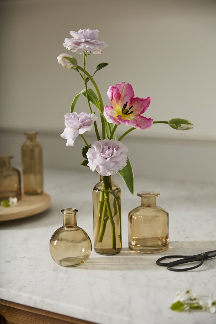 Create a vintage-inspired, whimsical display with Carlotta Budvases, featuring bottle-shaped necks & openings. Designed to layer together for home, event or everyday occasions, these versatile light brown glass bottles come in varying heights but the same size openings for easy arranging with a small collection of floral stems. Gently handwash to protect color & store in room temperature so that the finish does not bubble.