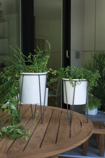 The modern Cassa Plant Stand features a simple ceramic pot with a beautiful glaze, fitted in a metal stand with hairpin legs for a unique piece perfect for your urban space.