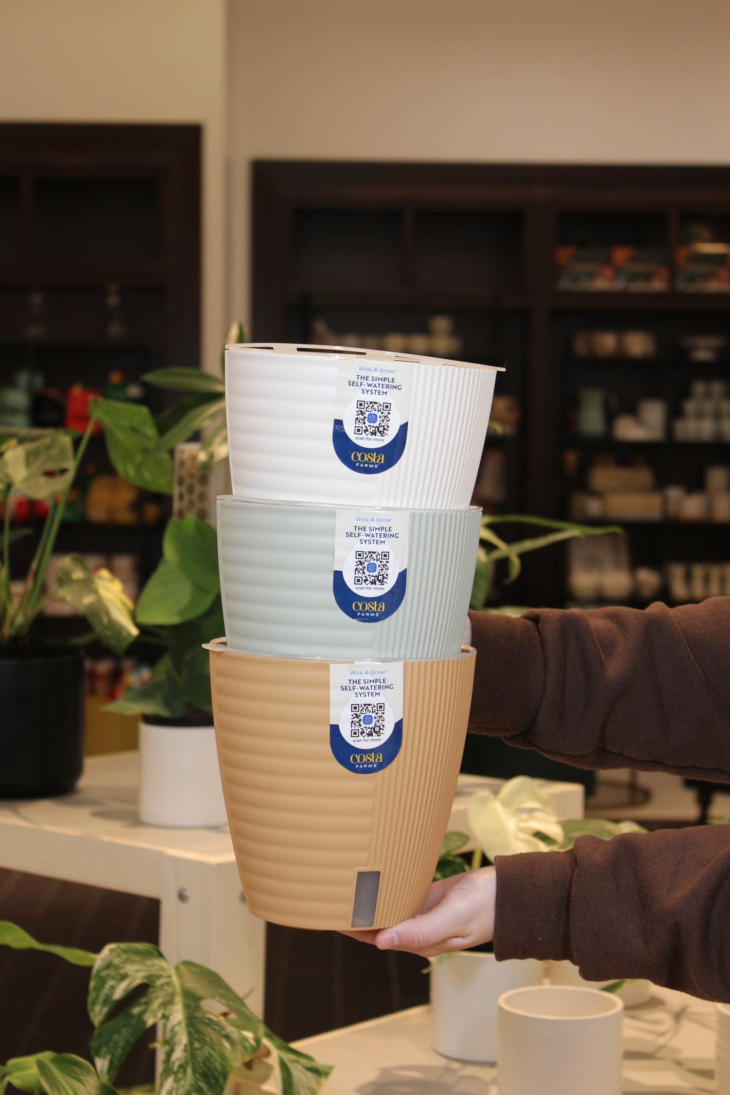 The Wick & Grow® self-watering system is based on a specially designed blue-and-white Waterwick® (it looks like a string) that serves like a straw for your plant. As your plant roots drink water from the potting soil, the Waterwick® draws that same amount of moisture up from a water reservoir below the pot.