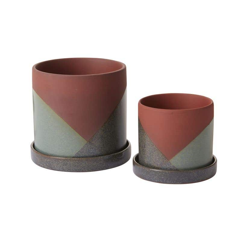 Layered glazing on the small terracotta El Cerro Pot creates an artistic flair for your shelves. Beautiful green contrasts against the warm terracotta base. A drainage hole keeps plants from holding excess moisture, while a saucer protects surfaces.