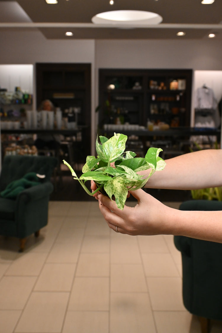 Pothos, Epipremnum, Scindapsus plants are some of the easiest out there. They can tolerate low light, and are drought tolerant. Water when the soil is dry about 50%. Keep them in a well-aerated soil.