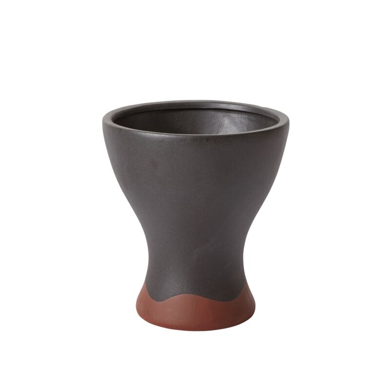 Whether adding height to a drop-in plant or displaying fresh or dried florals, the small, curvy Kanako Pot elevates any arrangement with its unique, flared shape & organic finish of a black reactive glaze on a brown terracotta base. Create a chic, dimensional look for a flower or plant display without the addition of a stand.