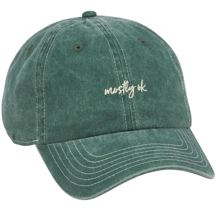 Anyone else done with keeping every little thought to themselves? This green baseball cap displays a relatable sentiment that reads "Mostly Ok" in a hand written style for honest self-expression. Stylish design is fully embroidered on stonewashed cotton for a naturally worn look. Questionables baseball caps are one size fits most with an adjustable buckle closure to create the perfect fit. Hand wash only. Our Mostly Ok baseball cap is perfect for everyday expression.