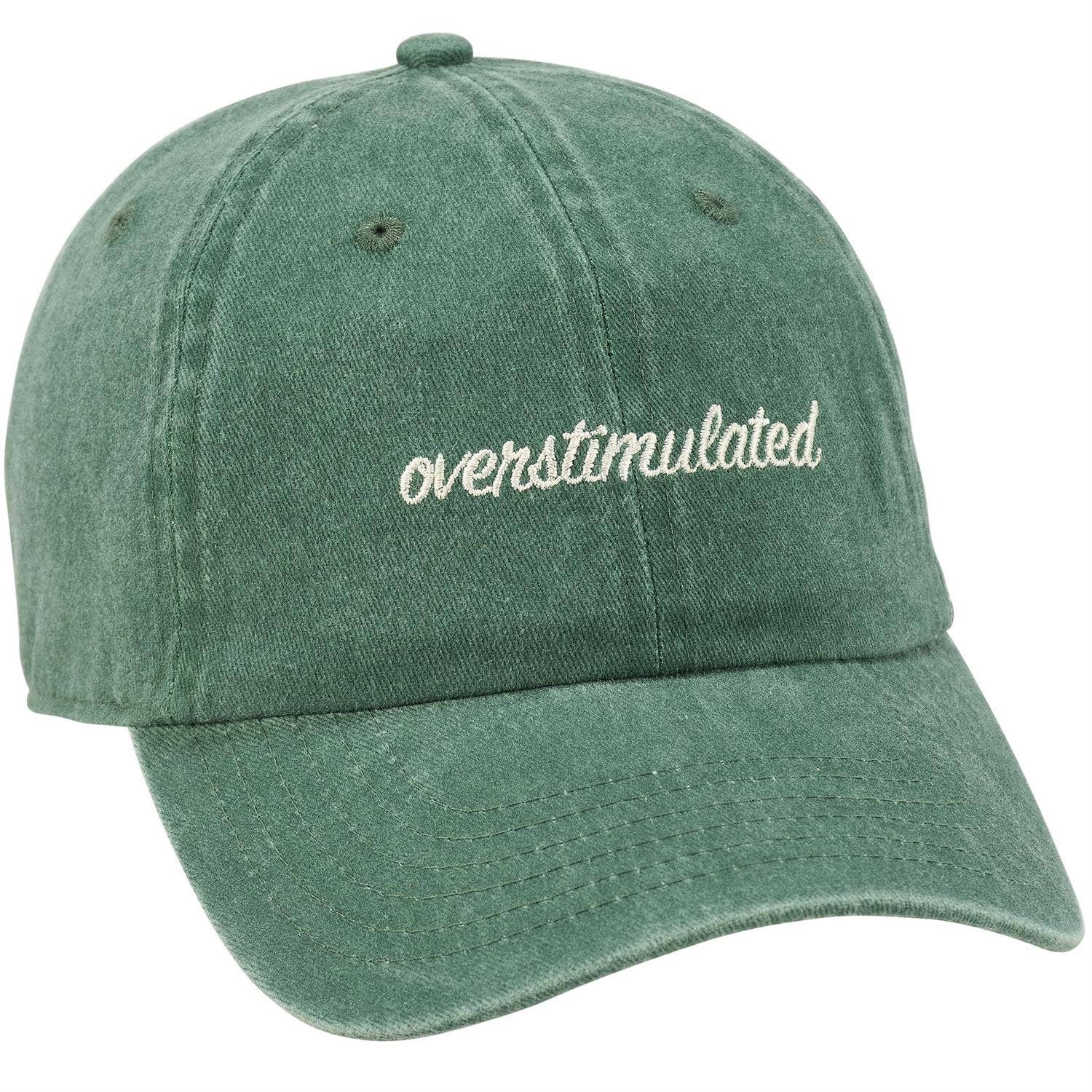 Anyone else done with keeping every little thought to themselves? Let 'em know exactly what's going on under this green baseball cap displaying a relatable sentiment that reads "overstimulated" in a hand written style for honest self-expression. Sentiment is fully embroidered on stonewashed cotton that gives a naturally worn look. These baseball caps are one size fits most with an adjustable metal buckle to create the perfect fit. Hand wash only. Our Overstimulated baseball cap is perfect for everyday expression in an honest and relatable fashion.