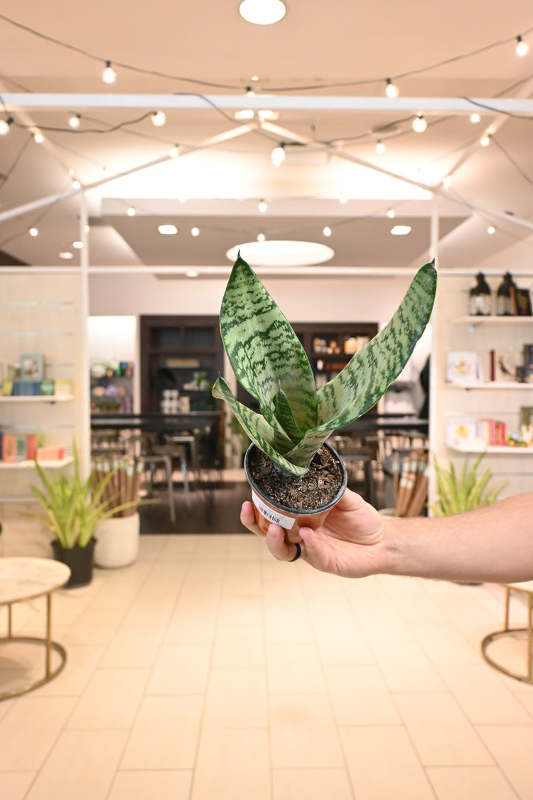 Sansevieria are low-maintenance, and easy-going. They tolerate low light and low humidity. Allow their soil to completely dry out between waterings.