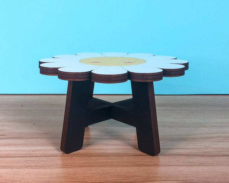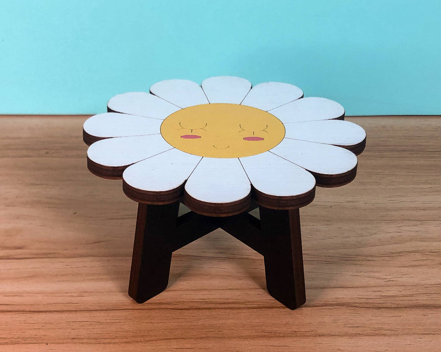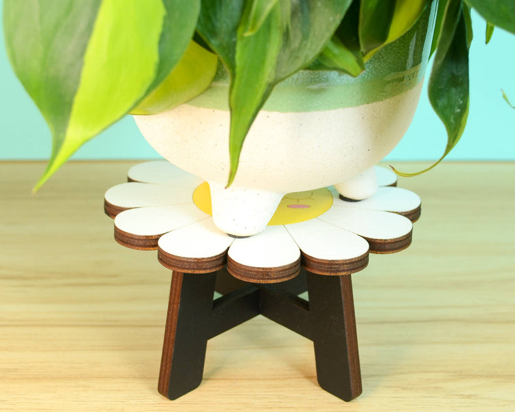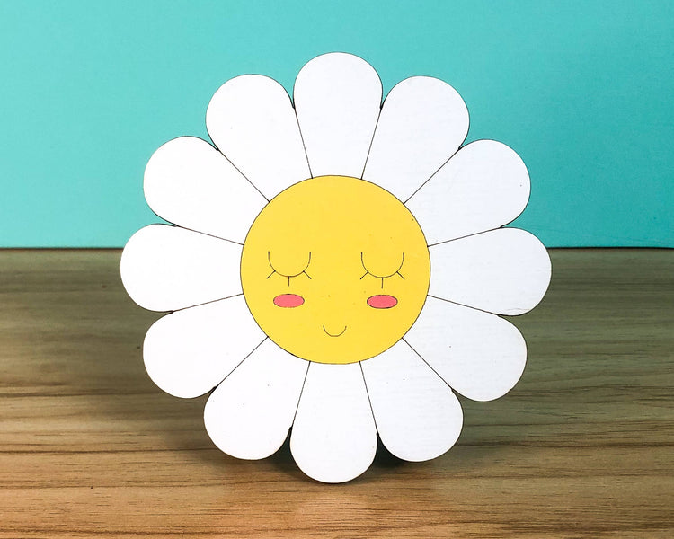 Spread sunshine and smiles with this delightful daisy-shaped plant stand featuring a sweet happy face. The white petals and sunny yellow center with rosy cheeks bring instant joy to any plant display. Product Details: Dimensions: 5" wide x 2.75" tall Laser cut from 1/4" thick wood White petals with yellow center and pink cheek details Water-resistant polycrylic coating for durability. Fits 4" pots and smaller perfectly. Hand-painted with cheerful facial features Adorable closed-eye smile design.