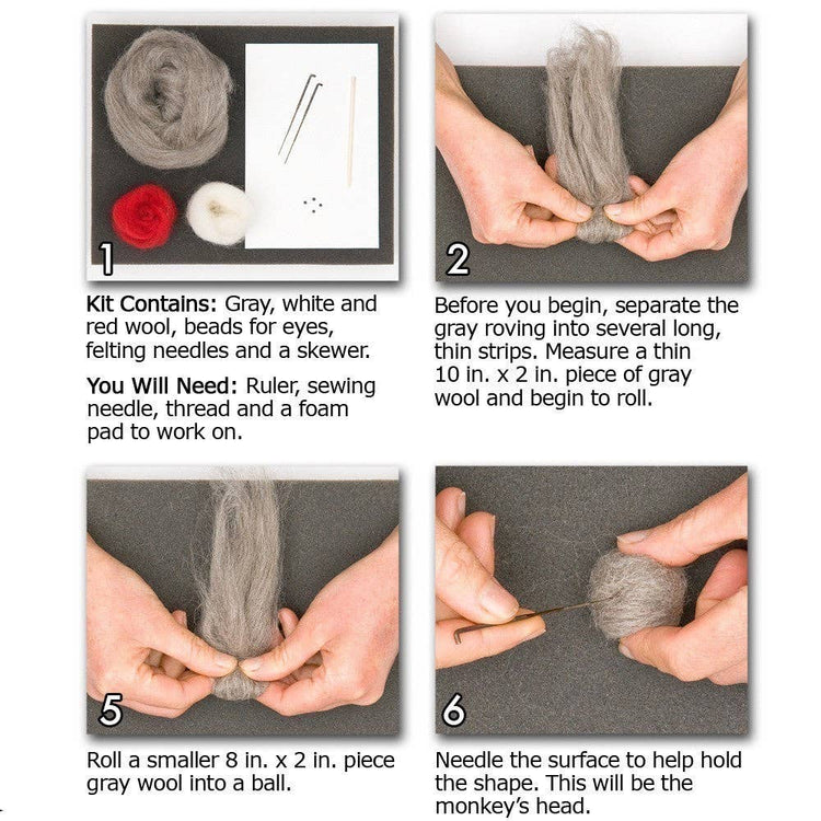 Make a funky monkey. If you have run out of socks to make Monkeys, we have you covered. Turn a handful of wool into your own fuzzy, felted Sock Monkey. No socks required. This needle felting kit will make at least one Sock Monkey. Learn the art of sculptural needle felting and start your own woolly Monkey hut.