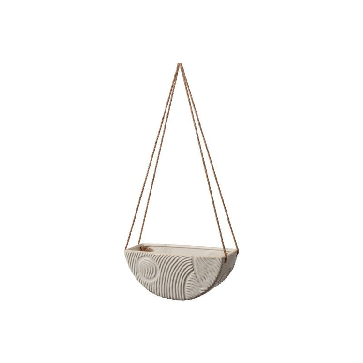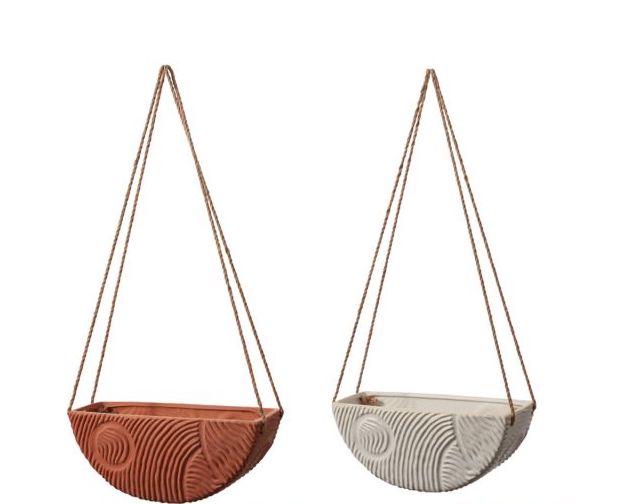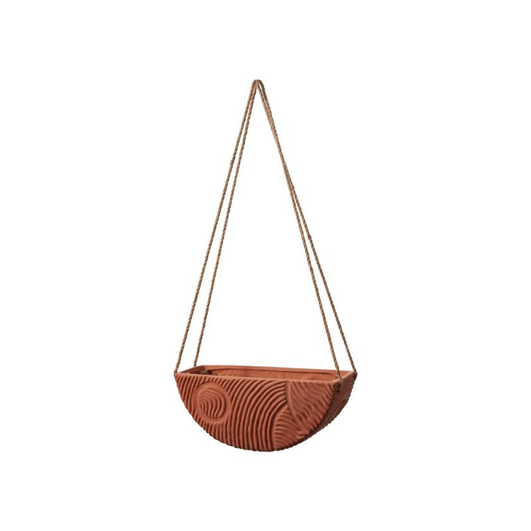 Take your plants to new heights and adorn your porch or indoor spaces with the natural look of the Topography Hanging Planter. This half-moon terracotta pot, featuring an organic etched pattern, is perfect for trailing plants or a succulent collection.
