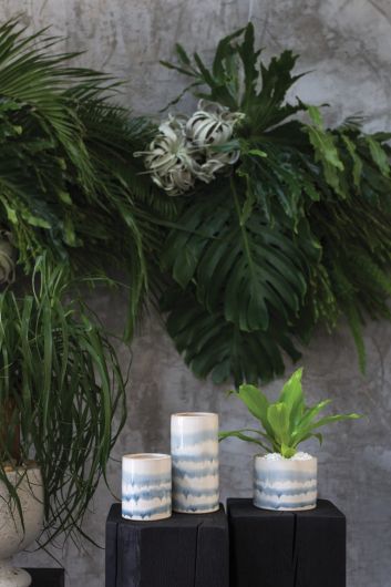 The Waterfall Pot offers a simple silhouette and unique finish first glazed in ivory, then hand-painted with a fresh watercolor design.